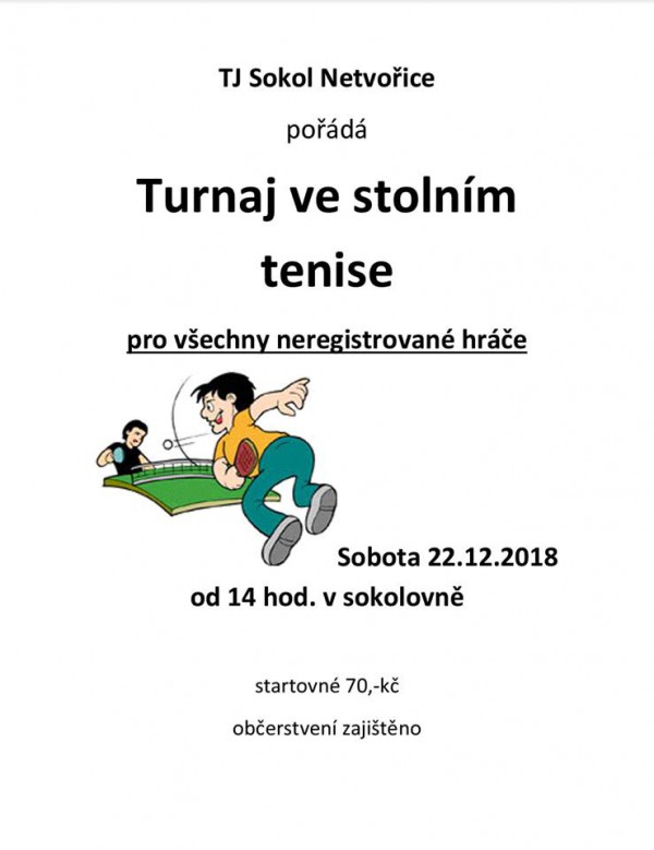 Jako každý rok, tak i letos se v naší sokolovně uskuteční vánoční turnaj neregistrovaných hráčů ve stolním tenise. Akce proběhne v sobotu 22. 12. 2018 od 14:00. Startovné je 70 Kč a občerstvení je pro vás samozřejmě zajištěno.